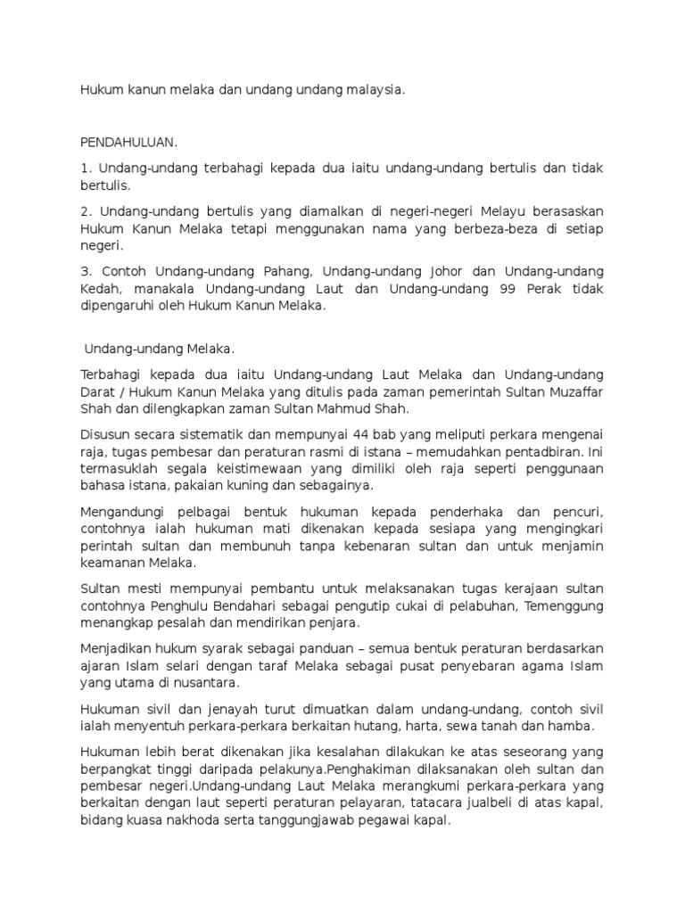 Norma hukum penting lainnya di melaka adalah undang undang melaka meskipun undang undang ini masih berisi pasal. Menurut r o winstedt dan josselin de jong yang meneliti dan menyelenggara teks undang undang laut melaka undang undang ini dipercayai telah disusun pada zaman pemerintahan sultan mahmud syah dan bendahara seri maharaja. Selain itu terdapat juga hukuman untuk perbuatan jenayah meliputi perbuatan membunuh dan menikam orang menetak dan memukul merampas dan mencuri tidak menurut perintah raja dan menderhaka serta tuduh menuduh. Undang undang laut melaka jawi.