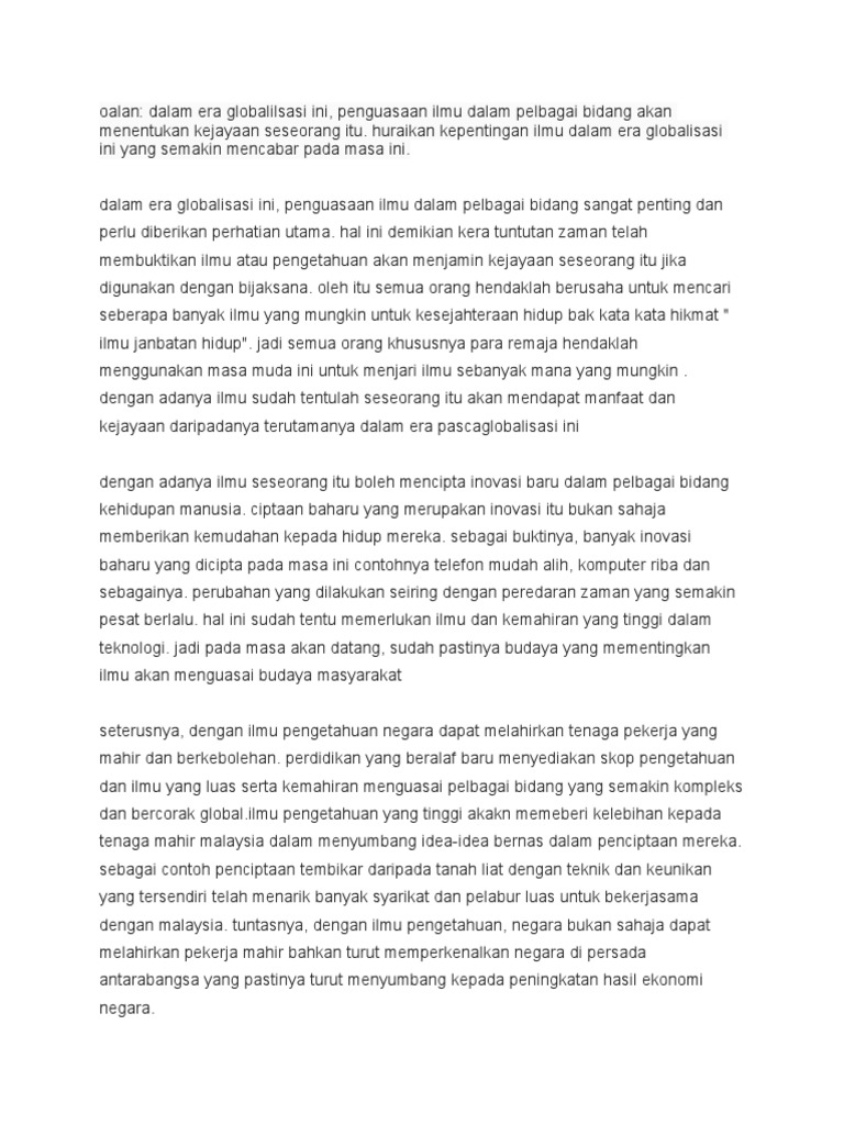 Dalam rangka membangun masyarakat yang adil dan makmur yang tetap berkepribadian indonesia kita harus tetap beriman dn bertaqwa kepada tuhan yang maha esa. Dalam era globalisasi ini penguasaan ilmu dalam pelbagai bidang akan. Huraikan kepentingan ilmu dalam era globalisasi ini yang semakin mencabar pada masa ini. Jadi ekonomi yang berasaskan pengetahuan sudah menguasai dunia perniagaan pada masa ini.