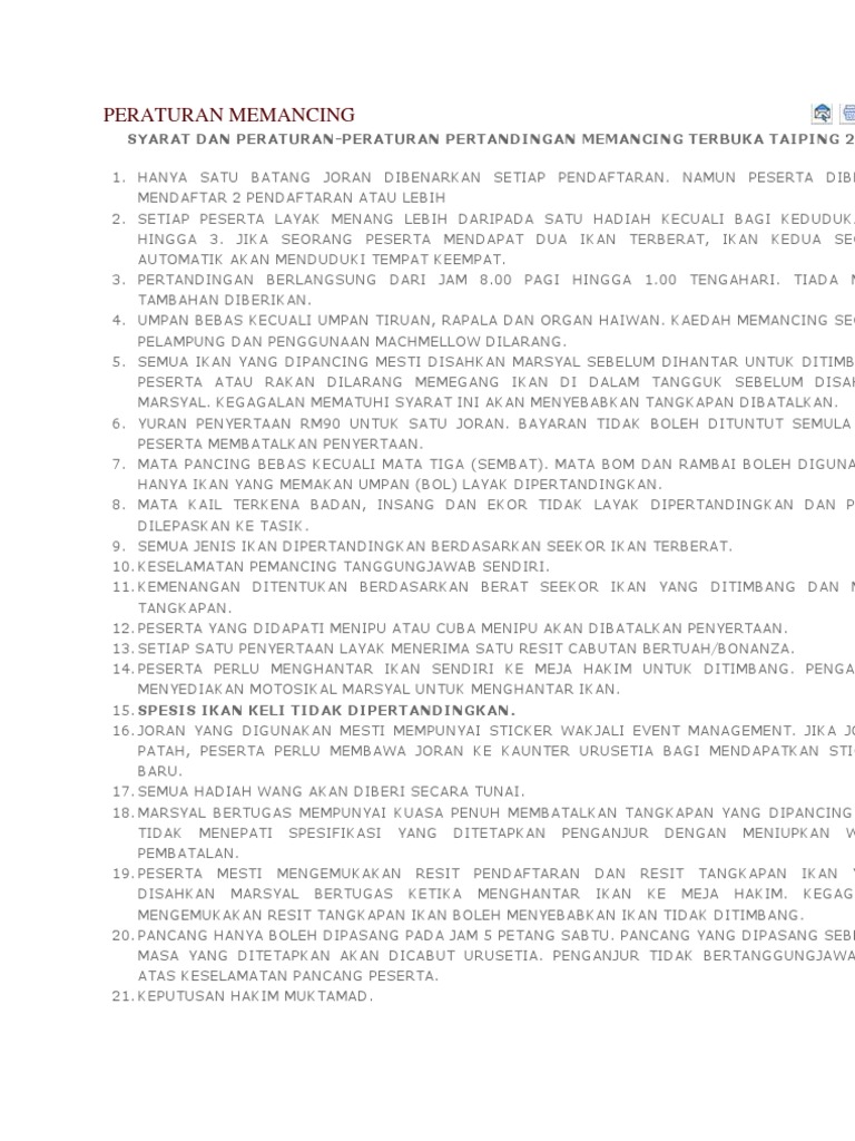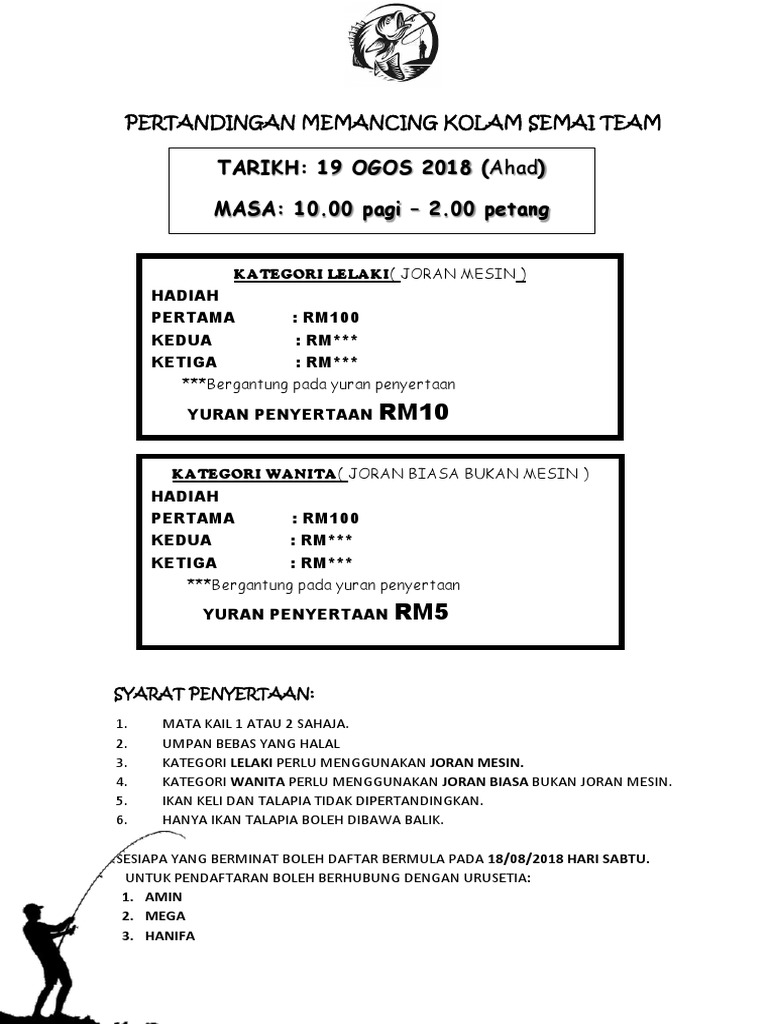 Tujuan pertandingan ini diadakan bertujuan untuk memberi pendedahan kepada guru dalam mengurus dan mengelola kejohanan amnya dan badminton khususnya. Iklan pertandingan memancing kategor pantai kolam tasik sungai laut dalam shj. Documents similar to kertas pertandingan memancing. Tarikh tutup penyertaan 28 nov 2015 sabtu 3.