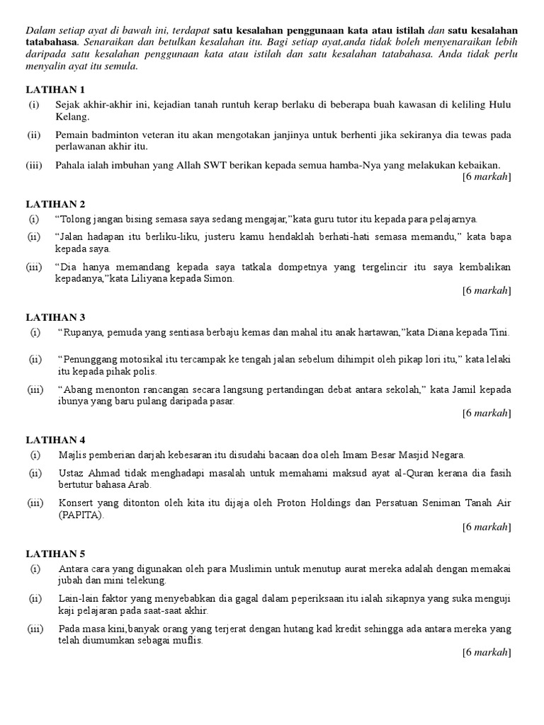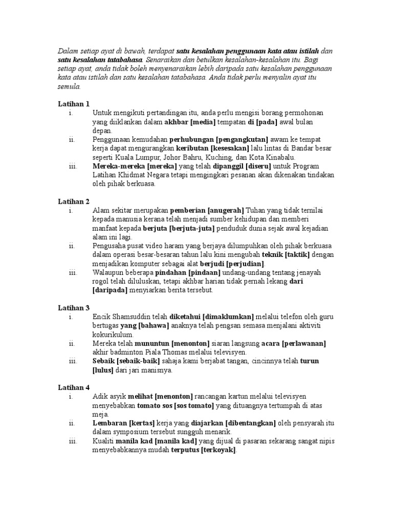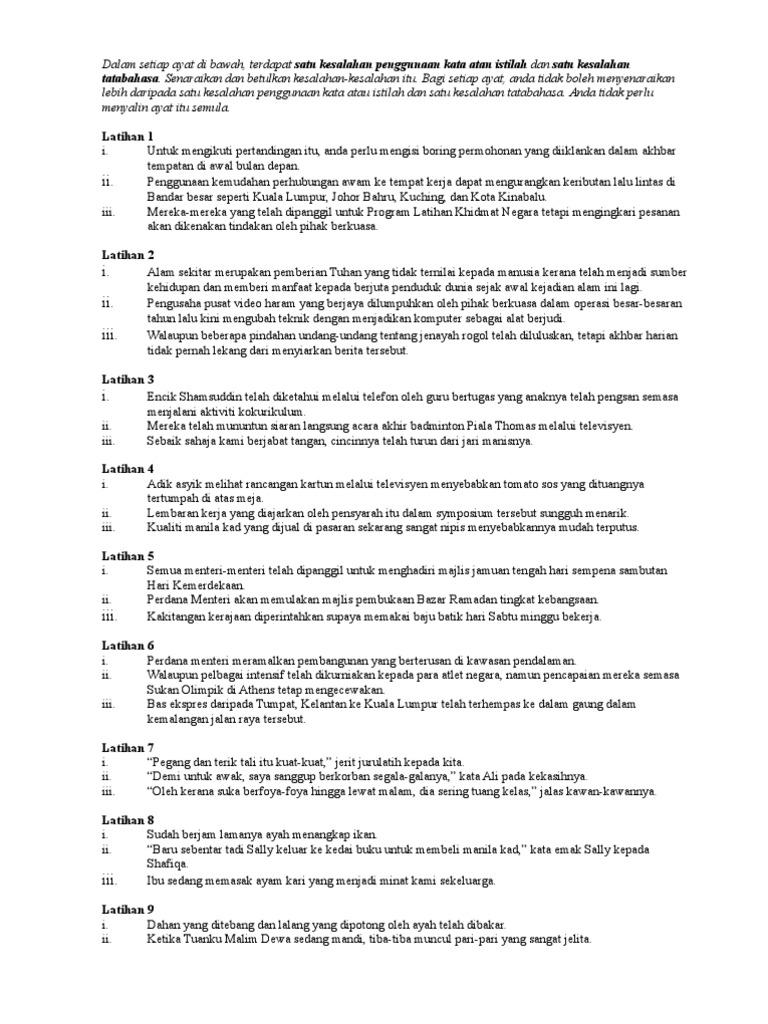 Kesalahan penggunaan kata dalam bahasa melayu merupakan salah satu daripada aspek kesalahan umum bagi kebanyakan penutur. Kesalahan istilah bermaksud kesalahan penggunaan kata iaitu penggunaan perkataan yang tidak sesuai dengan kehendak ayat atau situasi. 8 21 2013 3 mengesan kesalahan kata istilah dan tatabahasa a. Betulkan ayat tersebut tanpa menulis semula ayat tersebut.