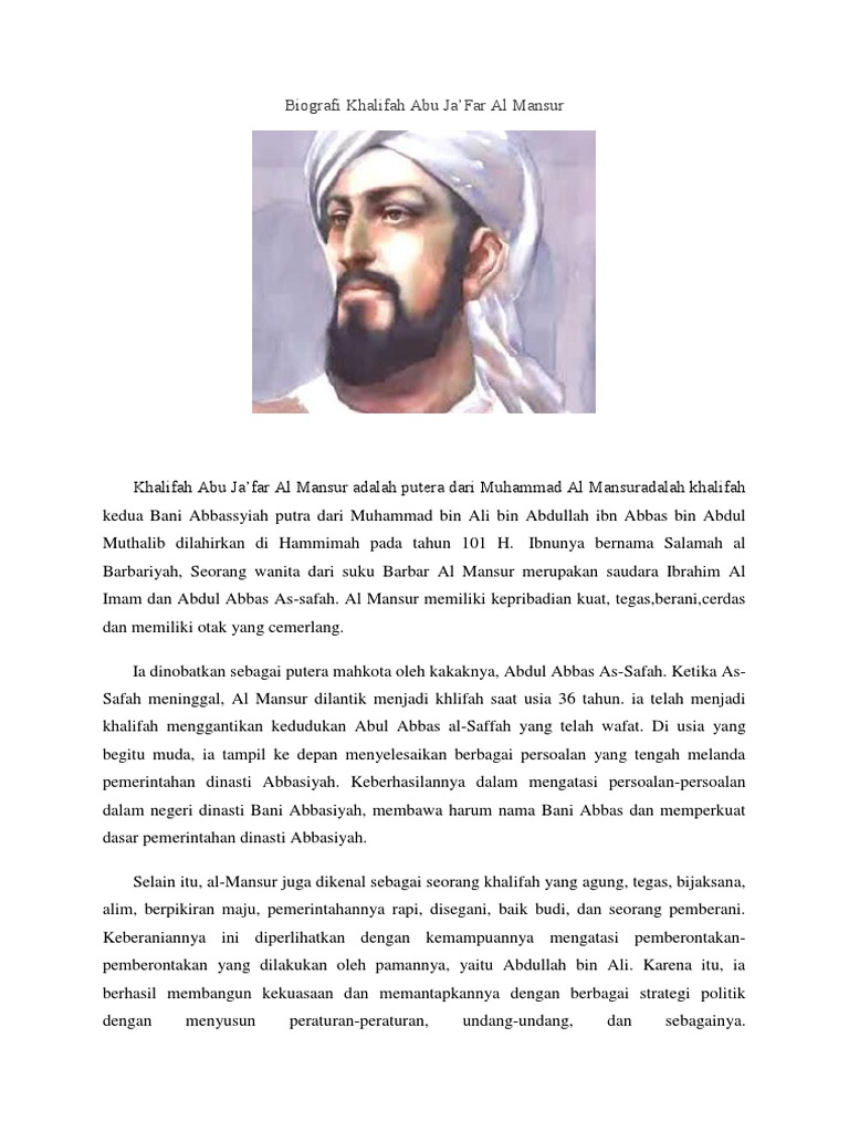 Al mansur is generally regarded as the real founder of. Abu jafar abdullah bin muhammad al mansur 714 775. Tetapi setelah abu ja far al manshur menjadi khalifah dan memutuskan untuk menjadikan baghdad sebagai ibukota khilafah abbasiyyah maka baghdad pun berubah. Though he was actually the second abbasid caliph he succeeded his brother only five years after the overthrow of the umayyads and the bulk of the work was in his hands.