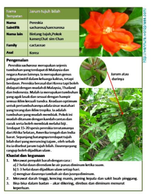 Khasiat jarum tujuh bilah. Jarum tujuh bilah jarum tujuh pokok kanser atau chat sim chan pereskia sacharosa saecnarosa merupakan sejenis pokok yang terdapat di malaysia dan negara asea lainnya tumbuhan dari keluarga kaktus ini mungkin satu satunya kaktus yang mempunyai daun yang sebenar ia merupakan genus paling primitif dalam keluarga kaktus. Saya mencari maklumat tentang khasiat pokok ini di internet pokok ini sebenarnya daripada keluarga kaktus.