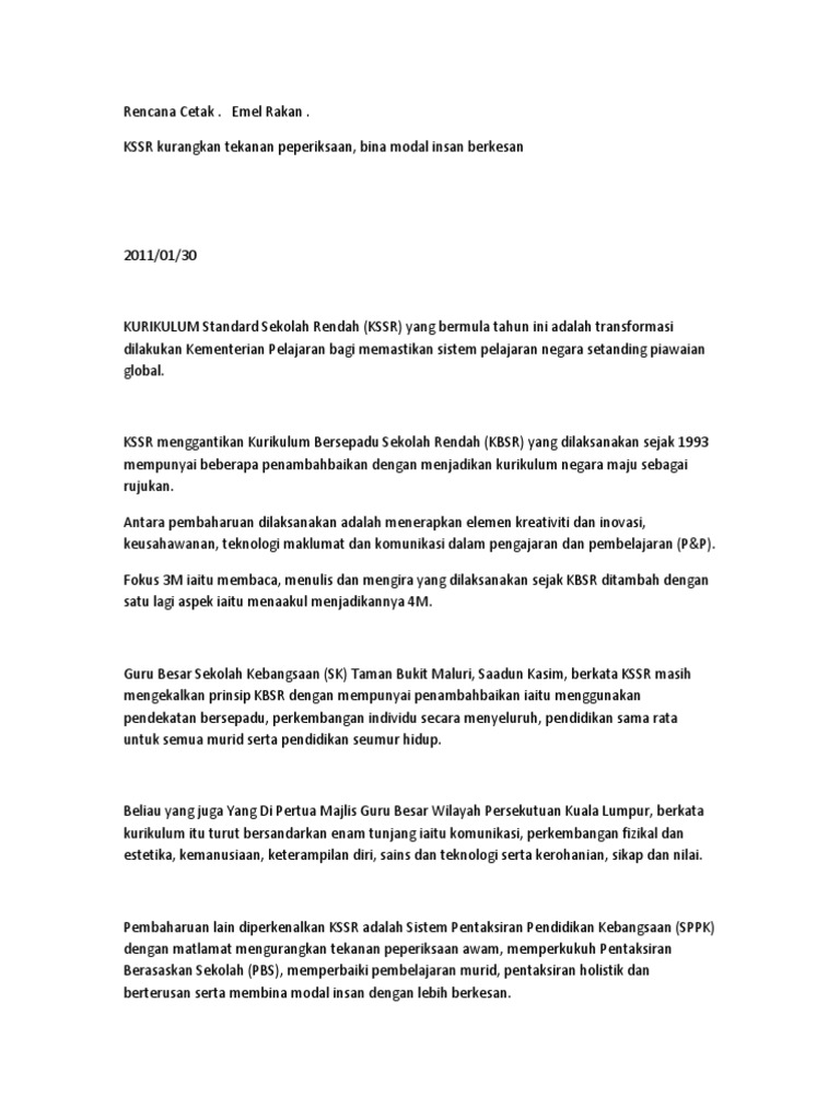 Kurikulum standard sekolah rendah kssr yang mula diperkenalkan dan diterapkan kepada murid tahun satu pada tahun 2011 masih lagi dalam proses penambahbaikan. Pentaksiran sekolah dilaksana dalam bentuk pentaksiran formatif yang dijalankan seiring dengan proses pengajaran dan pembelajaran atau pentaksiran sumatif di akhir unit pembelajaran semester atau tahun. Aspek pengujian dan penilaian dalam kurikulum baru sekolah rendah kbsr ujian diagnostik darjah 3 telah digantikan dengan penilaian tahap satu pts yang dapat dijalankan selama tiga tahun sebelum dimansuhkan. 2 12 masalah masalah dalam pelaksanaan pentaksiran berasaskan sekolah pbs 42.