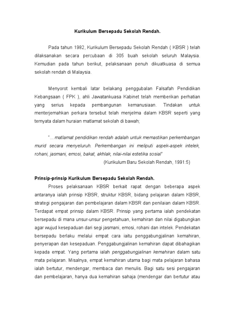 Kurikulum Bersepadu Sekolah Rendah Kbsr Diwujudkan Pada Tahun 1989