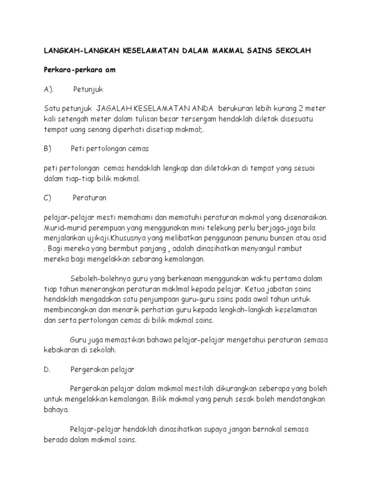 Pengurusan keselamatan murid di sekolah yang perlu dititikberatkan oleh semua. 1 1 bahan kimia terdapat berbagai bagai jenis bahan kimia berbahaya yang sering digunakan dalam makmal sains sekolah pada masa ini. Kesimpulannya keselamatan pelajar menjadi tanggungjawab semua pihak. Mendengar arahan guru yang berada di dalam kelas.
