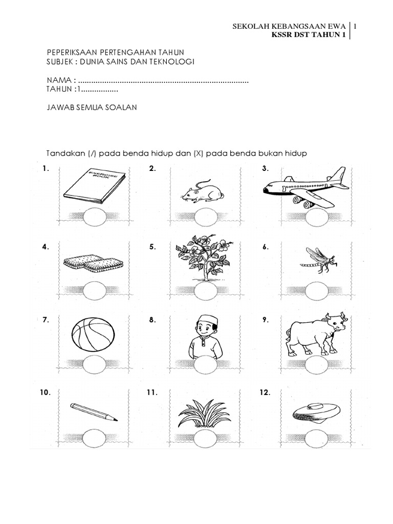 Tandakan pada benda hidup dan tandakan x bukan benda hidup. Dst t1 b1d2e1 2. Unit 1 benda hidup dan bukan hidup unit 2 manusia unit 3 haiwan unit 4 tumbuhan unit 5 mata untuk melihat unit 6 hidung untuk menghidu unit 7 lidah untuk merasa unit 8 kulit untuk menyentuh unit 9 telinga untuk mendengar unit 10 menggunakan semua deria unit 11 timbul dan tenggelam. Tuliskan huruf awal bagi.