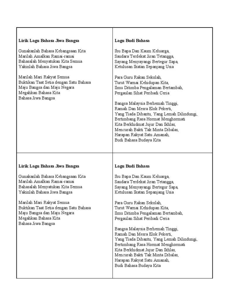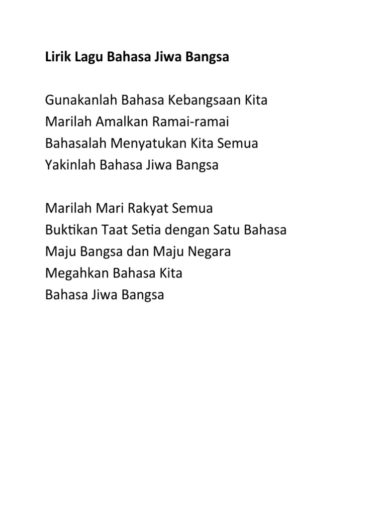 Lirik lagu bahasa jiwa bangsa. Kita satu bangsa kita satu negara dia bukanpun satu bangsa dan bukanpun satu negara dengan kita kita satu malaysia. Lirik lagu bahasa jiwa bangsa. G em am d g g c satu nusa satu bangsa g em a d satu bahasa kita g c tanah air pasti jaya g em am d g untuk selama lamanya. Scribd is the world s largest social reading and publishing site.