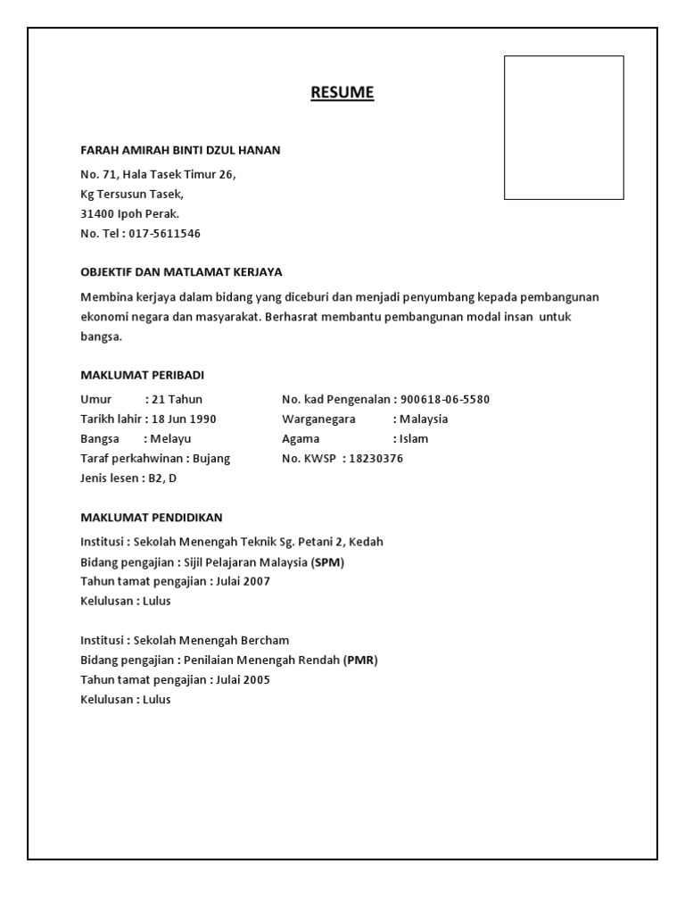 Contohnya kalau ada degree dan diploma letak degree terlebih dahulu. Maklumat peribadi nama penuh nicholas azizan umur 20 tahun tarikh lahir 30 jun 1984 bangsa. Matlamat kerjaya biasanya ditulis sebagai objektif dalam resume anda. Ia juga merujuk kepada kenyataan matlamat bagi kerjaya anda.