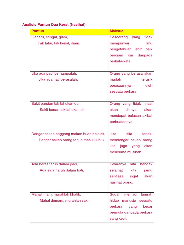 Pantun dua kerat cinta sejati. Dalam pantun seloka ada pantun lucu dan pantun jenaka yang mencuit hati tapi pada masa yang sama turut menyelitkan unsur nasihat. Kadang kadang juga ada kecewa. Pantun itu bermacam macam jenisnya. Pantun dalam bentuk pantun 2 kerat 4 kerat 6 ataupun 10 kerat adalah sebahagian daripada kesenian bahasa dalam budaya masyarakat nusantara samada untuk adat istiadat nasihat pendidikan gurauan hiburan majlis keramaian dan juga dalam perbualan harian perbezaan pantun dengan bahasa berirama dan puisi melayu lain ialah dari segi bentuk lenggok irama luahan fikiran dan emosi yang terjelma.