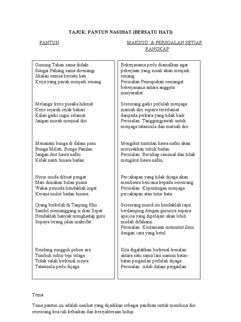 Pengalaman dan pemerhatian tersebut diungkapkan semula dalam baris baris yang walaupun terhad tetapi tidak menjejaskan mesej yang hendak disampaikan. Contoh pantun nasehat pantun adalah salah satu jenis karya puisi lama dengan 4 baris dan sajak a b a b di akhir larik baris pertama dan baris kedua berupa sampiran sedangkan baris ketiga dan keempat merupakan isi kali ini akan dibagikan contoh contoh pantun nasehat dan maknanya. Pantun empat kerat dan maksud 1 perwatakan watak utama dalam novel 1 puisi. Bagi pantun empat kerat baris satu dan dua adalah pembayang manakala baris tiga dan empat adalah maksud.