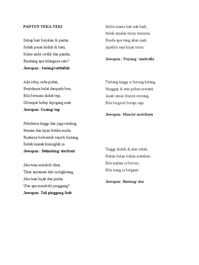 Pantun Teka Teki Dan Jawapan Dalam Pantun
