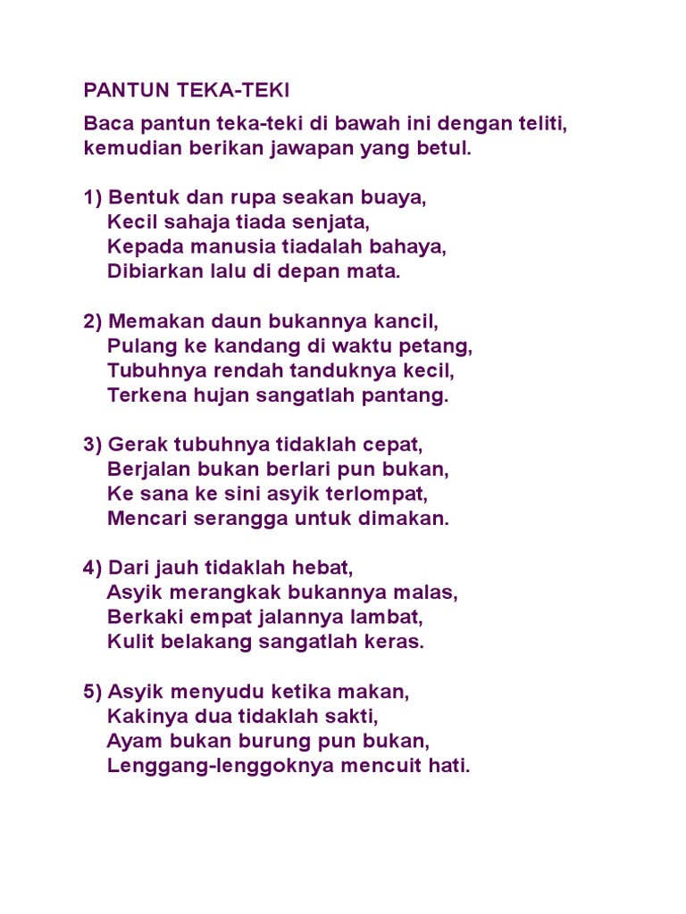 Sebenarnya berikut hanya pendahuluan sahaja dan ada lebih banyak data data yang kamiakan kongsikan dibawah ini. Belon jawapan 5. Buah melaka jawapan 7. Pantun teka teki adalah salah satu jenis pantun yang berisi berbagai ragam teka teki dan termasuk golongan dalam sebuah karya sastra.