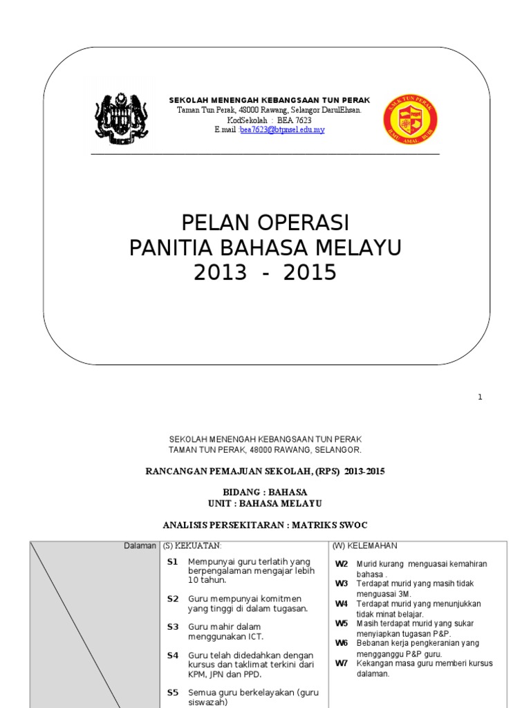 Sekiranya salah seorang mentor tidak hadir ke sekolah mantee akan dibahagikan kepada dua kumpulan mentor yang lain. Pelan strategik panitia bahasa melayu kepada guru guru yang mengajar bahasa melayu terutamanya dikongsikan di sini contoh pelan strategik bagi panitia bahasa melayu di dalam ini juga terdapat pelan operasi dan pelan taktikal kepada guru yang berminat bolehlah dapatkannya di sini. Pelan operasi mata pelajaran bahasa malaysia nama program. Sekolah menengah kebangsaan lubok merbau telah merancang perancangan strategik dari tahun 2014 2016 sebagai pelengkap kepada perancangan yang sedia ada selaras dengan hasrat untuk mencemerlangkan pendidikan negeri kedah darul aman seiring dengan hasrat kerajaan iaitu menjadikan malaysia negara maju menjelang tahun 2020.