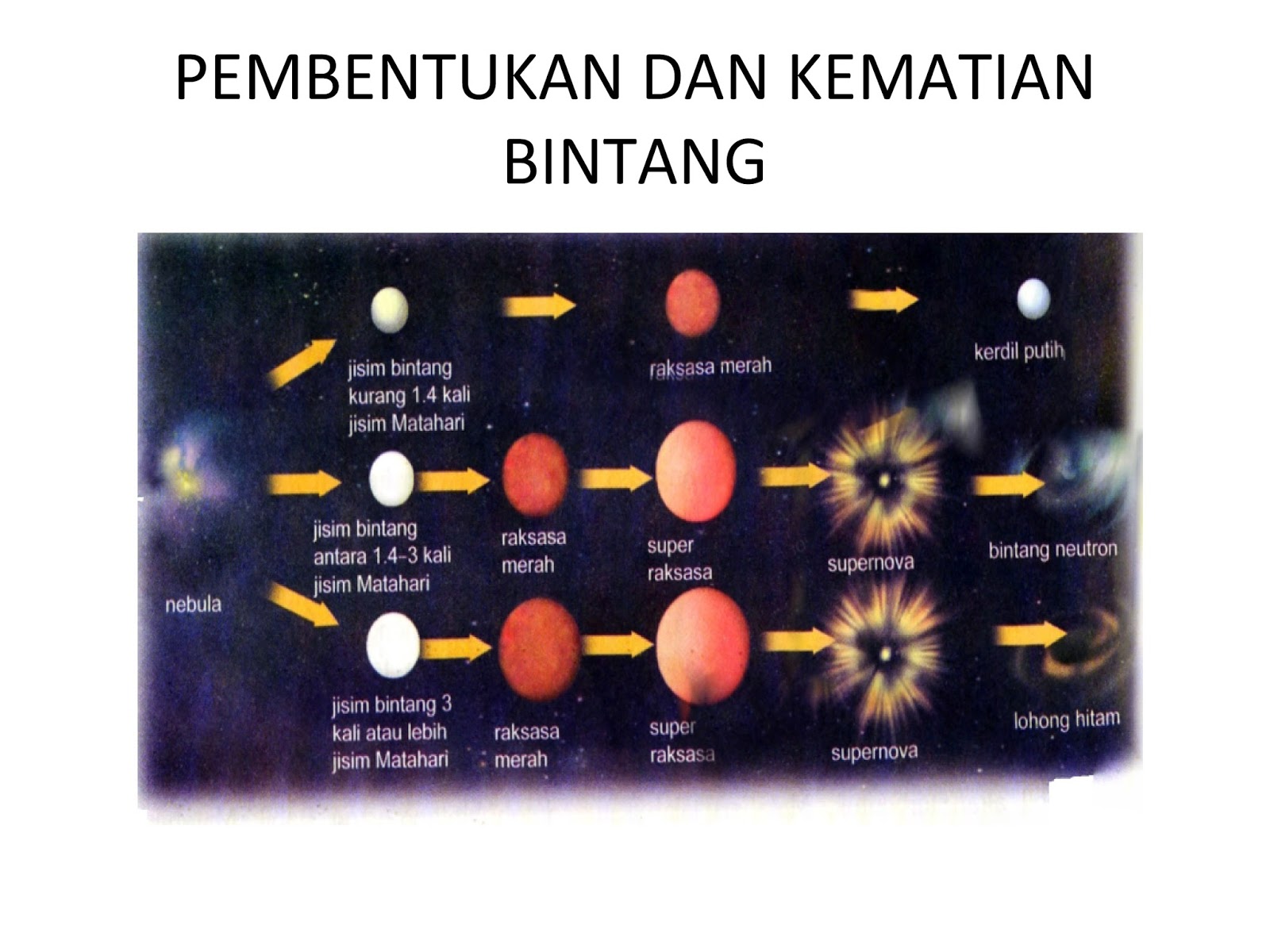 A bintang nebula yang berjisim sehingga 1 4 kali dari matahari kerdil putih b bintang nebula berjisim dari 1 4 and 3 0 c kali ganda dari matahari superraksasa supernova bintang neutron. Kematian bintang bintang mempunyai siklus kehidupan dan siapa apapun yang hidup tentu akan mati. Pandanglah langit yang cerah di malam hari dan kita akan menyaksikan bintang bintang yang berkedip di kejauhan. Nebula semakin mengecut akan membentuk bebola gas apabila zarah zarah debu dan gas bergerak menghampiri satu sama lain.