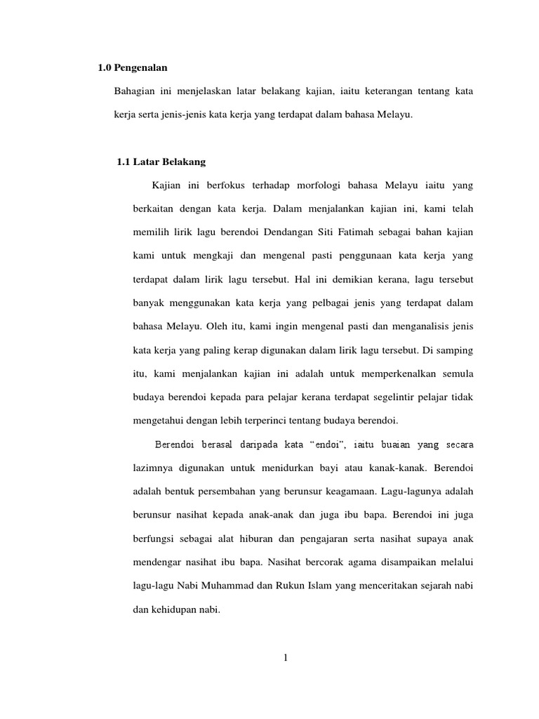 1 1 0 pengenalan dalam bahagian ini dihuraikan aspek latar belakang kajian dan definisi konsep 1 1 latar belakang menurut david crystal 2011 pragmatik merupakan kajian bahasa dari sudut pandangan pengguna berhubung dengan pilihan yang ada pada mereka berhubung dengan kekangan yang dihadapi sewaktu menggunakan bahasa dalam sesuatu. 9 0 penutup kajian ini telah memaparkan hasil dapatan yang berkaitan dengan morfologi bahasa melayu iaitu penggunaan kata kerja dalam lirik lagu berendoi dendangan siti fatimah mempunyai fungsi fungsi tertentu. 1 ragam bahasa ialah kata kata yang disusun khas untuk menyatakan sesuatu dengan pelbagai bentuk dan cara. Alhamdulillah syukur kami panjatkan kepada ilahi kerana dengan limpah kurnia nya dapat juga kami menyiapkan kerja kursus bahasa melayu kertas 5 910 5 penggal 3 tahun 2017 yang bertajuk penggunaan bahasa kasar dalam novel.