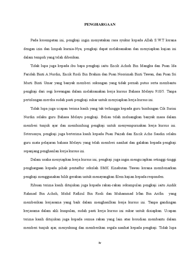Penghargaan kerja kursus bahasa melayu stpm penggal 3. Monday june 04 2018 ini merupakan kerja kursus berkumpulan yang memerlukan kai meminta izin dan kebenaran dari member member untuk publish entry ini. Berikut merupakan perkongsian saudari tanushah dalam blognya thanushahsoniyasee96 berkaitan bagaimana kertas kerja kursus bahasa melayu tingkatan 6 penggal 3 dilaksanakan. Pendaftaran medex keputusan medex muet on demand. Kandungan halaman penghargaan i 1 0 pengenalan 1 1 latar belakang 1 2 definisi konsep 2 0 objektif 3 0 kepentingan kajian 4 0 skop kajian 5 0 batasan kajian 6 0 kaedah kajian 6 1 mendapatkan data 6 2 mengumpulkan data 6 3 menganalisis dan mempersembahkan data 7 0 dapatan kajian 8 0.