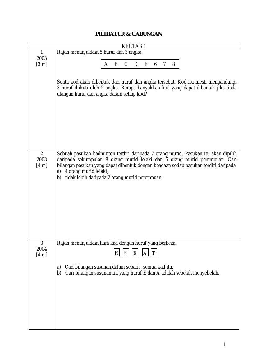 Ini menyentuh secara langsung di kawasan matematik yang dikenali sebagai kombinatorik yang merupakan kajian kiraan. 6 3 1 pilir atur dan gabungan spm praktis kertas 1 soalan 1. Empat huruf daripada perkataan bestari hendak disusun dengan syarat huruf pertama adalah vokal. Pilih atur dan gabungan assalamualaikum.