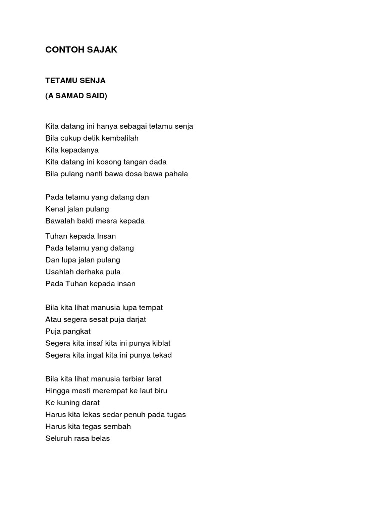Sajak a samad said tetamu senja. Catat ulasan atom info terkini. Kita datang ini hanya sebagai tetamu senja bila tiba detik kembalilah kita kepadanya. Cap kapak 17 289 views. Samad said dicatat oleh unknown di 5 35 ptg.