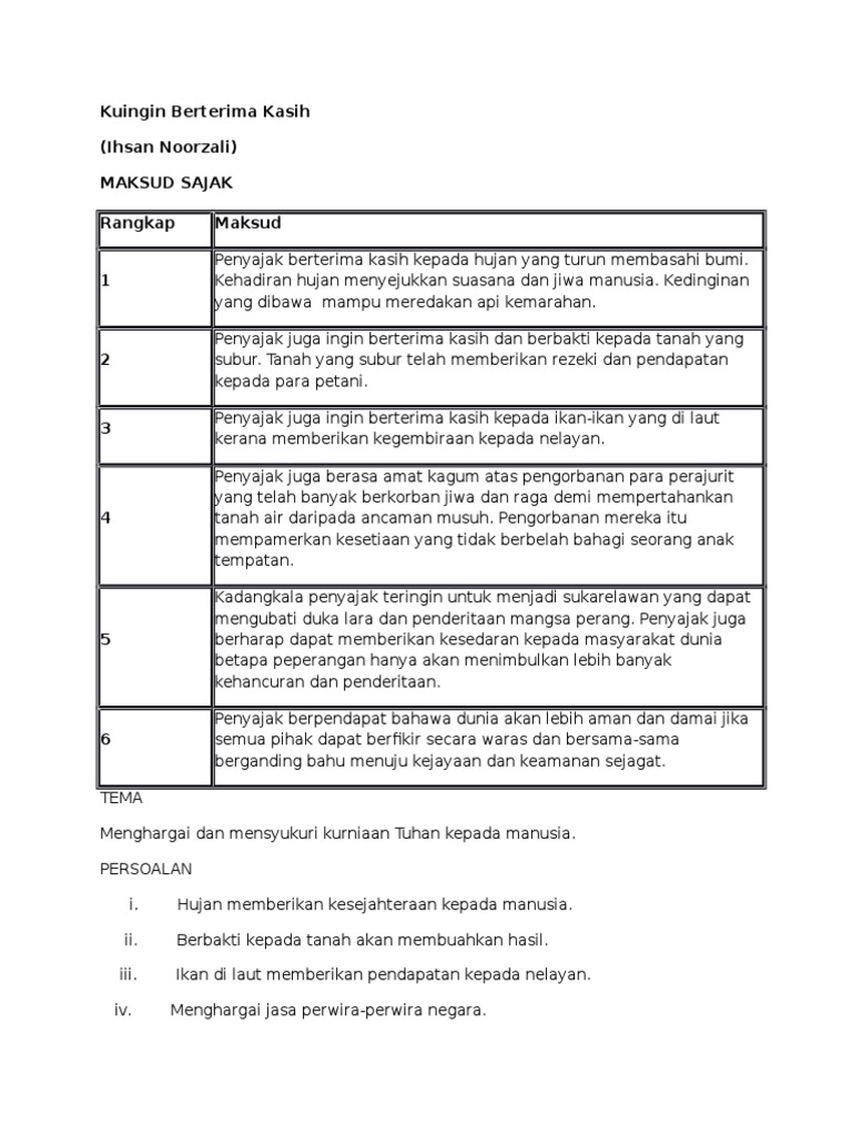 Maksud sajak tema persoalan bentuk gaya bahasa unsur bunyi nilai pengajaran sajak kuingin berterima kasih k komsas bm bahasa melayu tingkatan 1 pt3 komponen sastera dan novel bm bahasa melayu. Kuingin berterima kasih ihsan noorzali maksud sajak rangkap 1. Hujan bersifat menyejukkan iaitu menyejukkan jiwa dan menghapuskan perasaan marah. Kehadiran hujan menyejukkan suasana dan jiwa manusia.