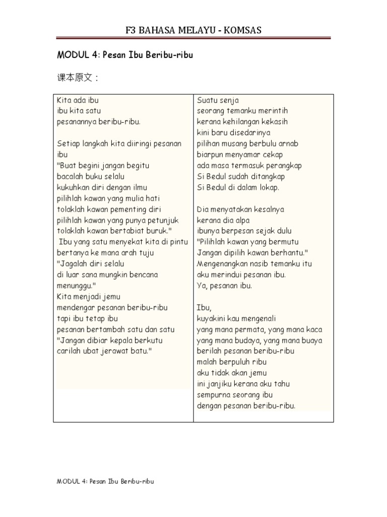 Komsas bahasa melayu tingkatan 3. Pengalaman yang mengajar manusia tentang erti kehidupan. Seorang ibu yang tidak pernah jemu berpesan dan memberikan nasihat kepada anak kesayangannya supaya tidak tersalah memilih. Lihat maksud sajak tema nilai persoalan gaya bahasa contoh soalan latihan dan banyak lagi.