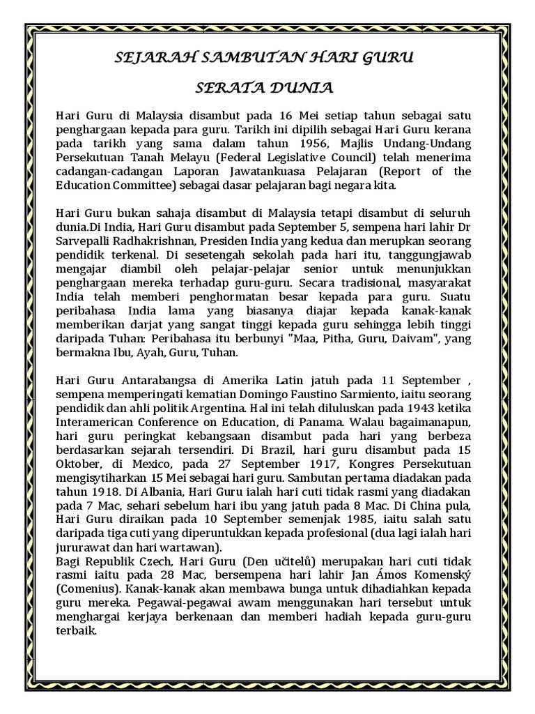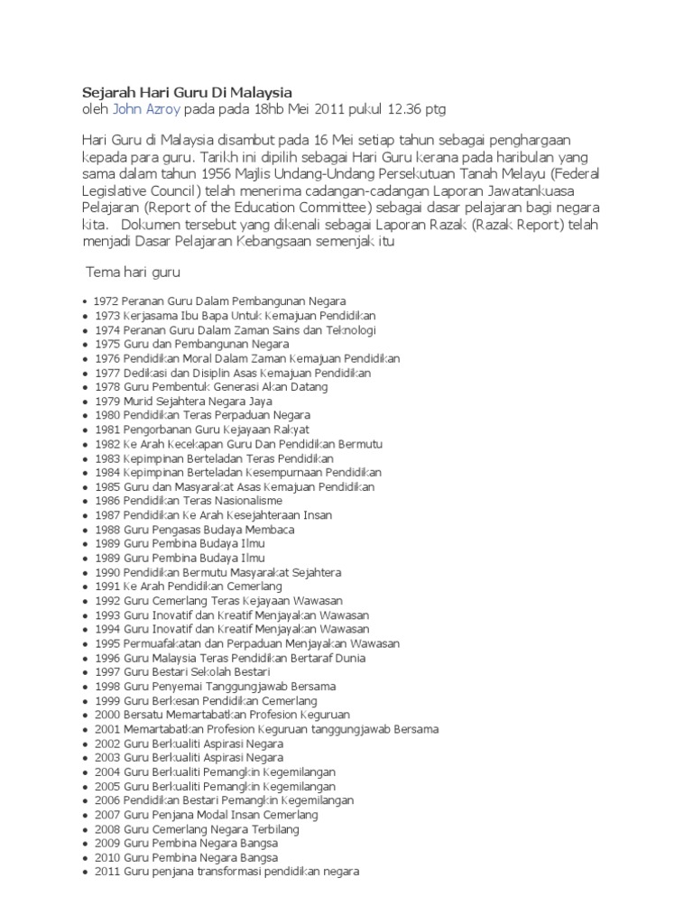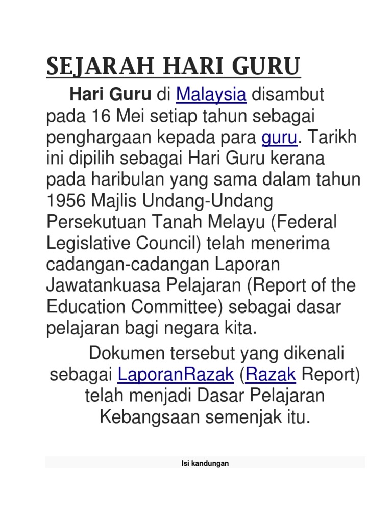 Laporan jawatankuasa itu diterima oleh pelajaran majlis undang undang persekutuan tanah melayu federal legislative council. Pada tarikh yang sama iaitu dalam tahun 1956 yang lepas mengikut sejarah malaysia melalui laporan razak. Tarikh ini dipilih sebagai hari guru kerana pada haribulan yang sama dalam tahun 1956 majlis undang undang persekutuan tanah melayu federal legislative council telah menerima cadangan cadangan laporan jawatankuasa pelajaran report of the education committee sebagai dasar pelajaran bagi negara kita. Sejarah hari guru di malaysia wajib baca hari guru di malaysia disambut pada 16 mei setiap tahun sebagai penghargaan kepada para guru.