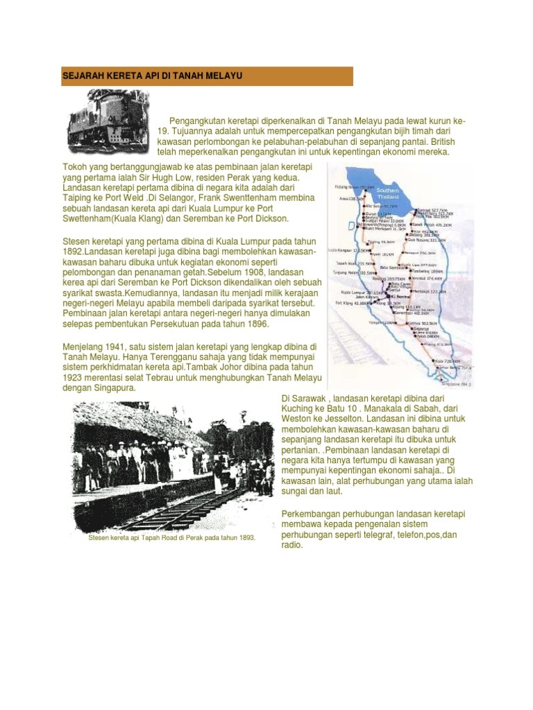 Sejarah kereta api tanah melayu. Penemuan bijih timah dinegara kita telah mendorong pihak penjajah. Ktmb merupakan operator kereta api utama di semenanjung malaysia. Inggeris memperkenalkan perkhidmatar keretapi di. A perkembangan landasan kereta api perkhidmatan kereta api diperkenalkan di tanah melayu akhir kurun ke 19 terdapat tiga fasa perkembangan.