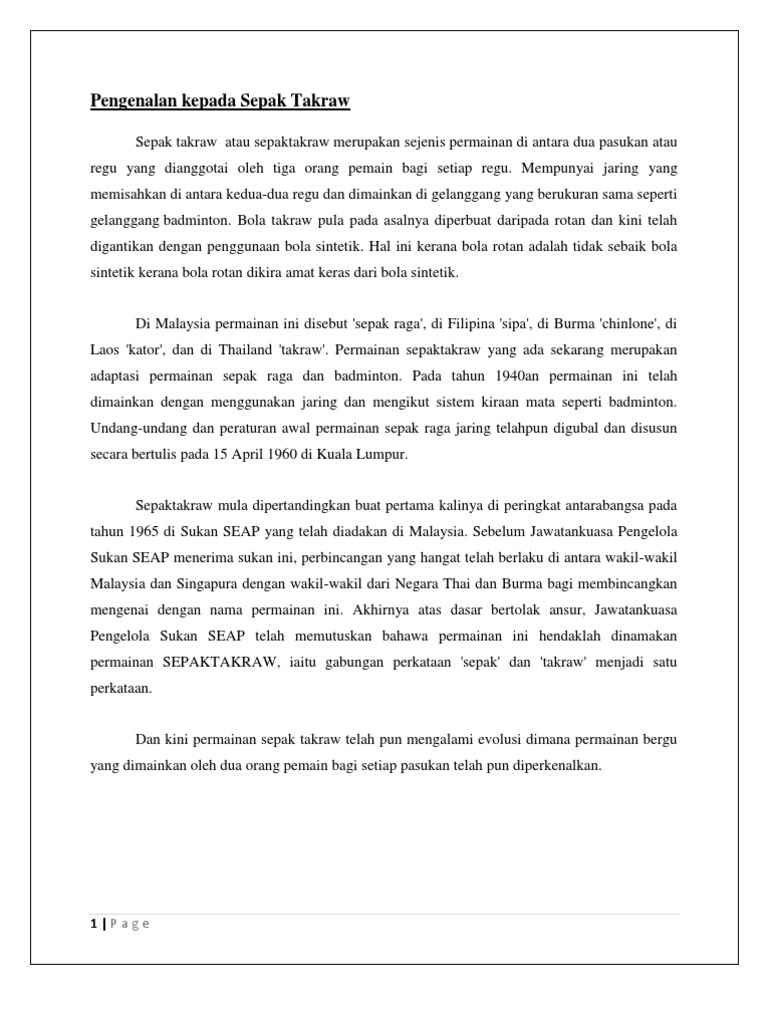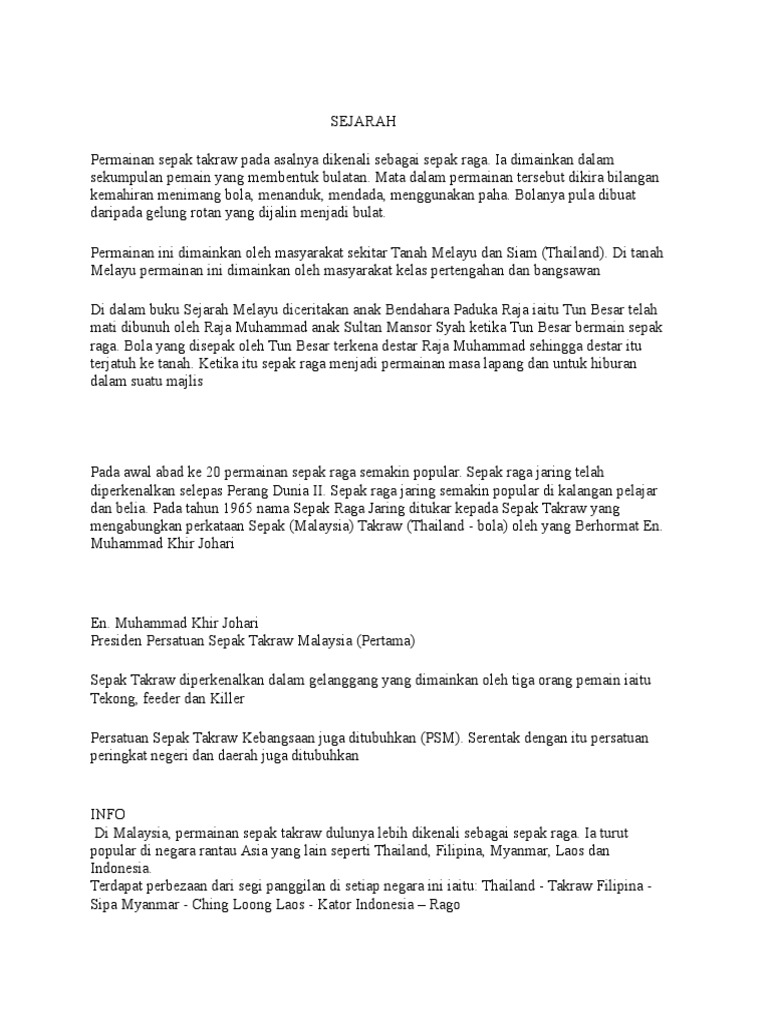In indonesia brunei singapore and malaysia it is called sepak takraw in malaysia it can be known as sepak raga as well. Sejarah permainan sepak takraw berasal dari dua kata iaitu sepak malaysia yang berarti menendang dan takraw thai yang bererti bola ayaman pemilihan nama untuk permainan ini merupakan kesepakatan dari dua negara pelopor iaitu malaysia dan thailand. Olahraga sepak takraw ini pertama kali dimainkan pada masa kesultanan melayu pada abad ke 15 yang pada kala itu dikenal sebagai sepak raga. Organisasi yang menjadi induk olahraga ini bernama perserasi.