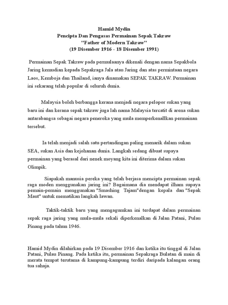 Mempunyai jaring yang memisahkan di antara kedua dua regu dan dimainkan di gelanggang yang berukuran sama seperti gelanggang badminton bola takraw pula pada asalnya diperbuat daripada rotan dan kini telah digantikan dengan penggunaan bola buatan. Pengasas sepak takraw dari pulau pinang freddie aziz jasbindar 14 february 2019 permainan sepak takraw adalah hasil ciptaan oleh seorang anak malaysia bernama hamid mydin yang menetap di kampung rawa jalan patani pulau pinang. Permainan sepak takraw sudah dikenal sejak abad ke 15 masehi.