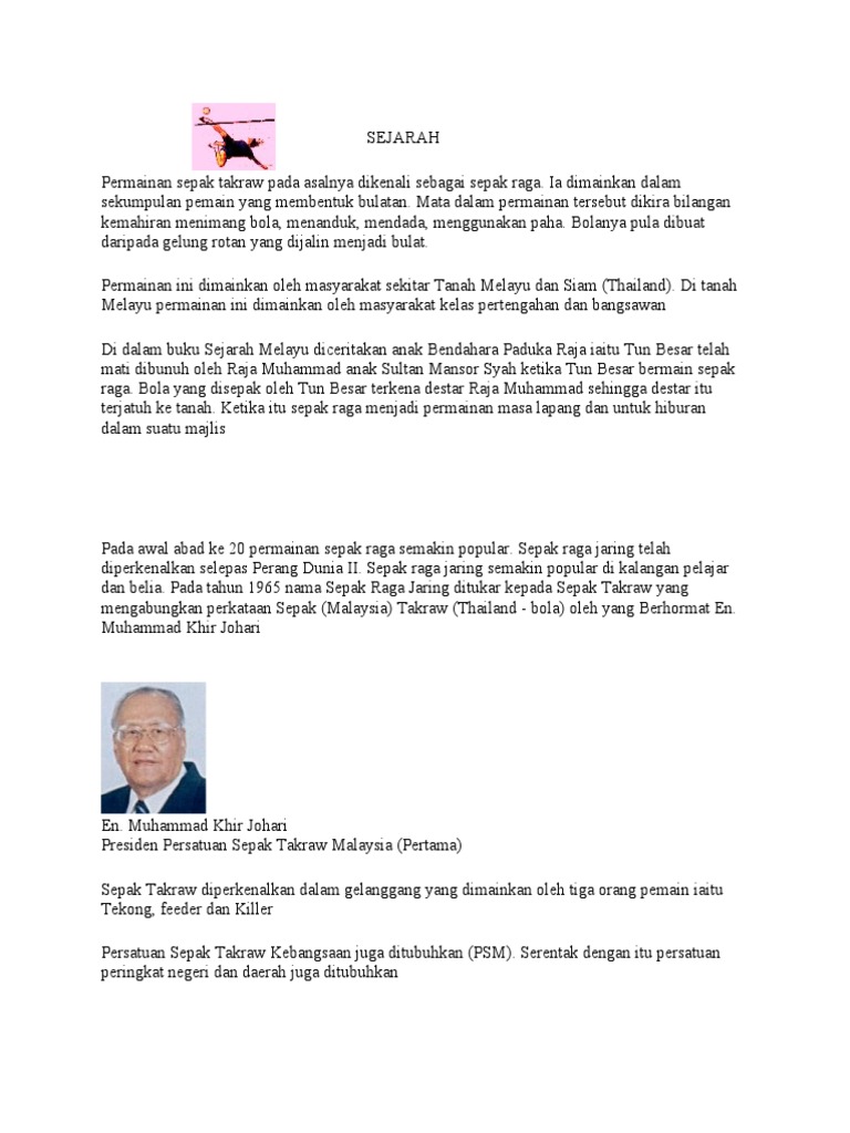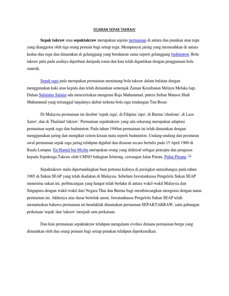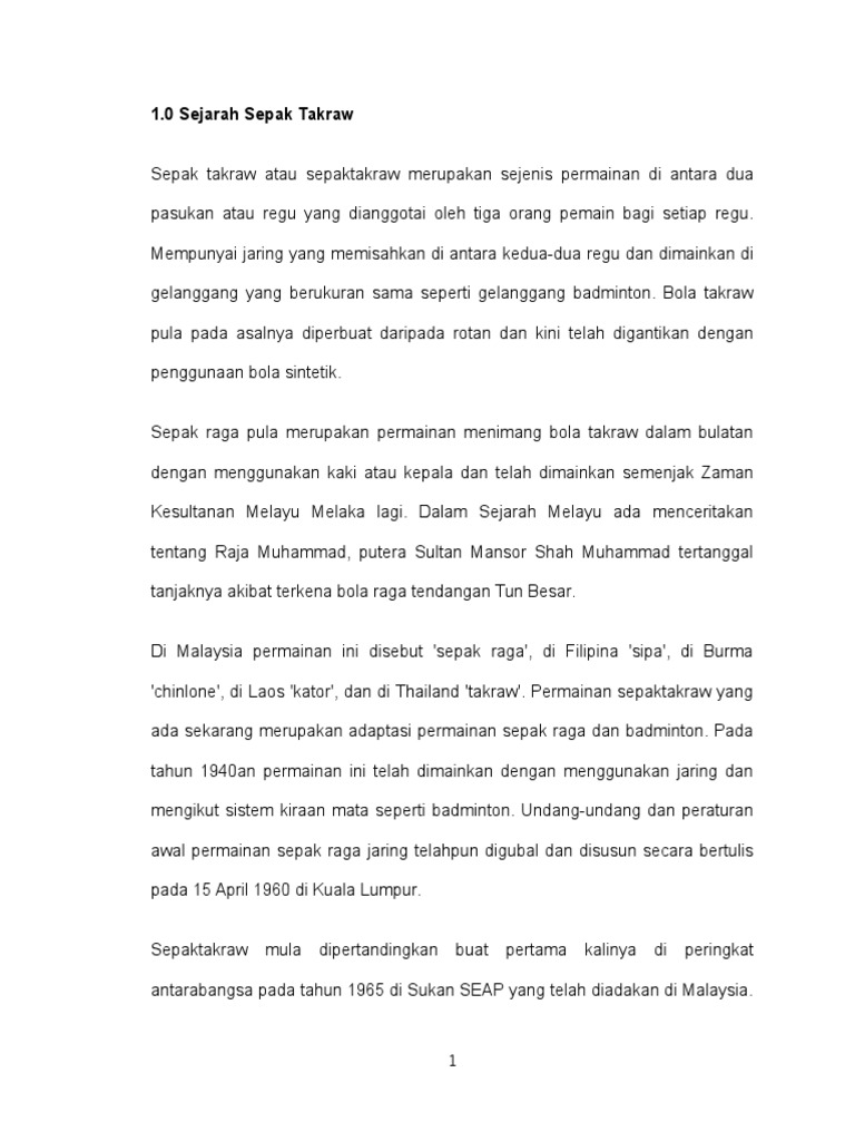 Sejarah sepak takraw malaysia. Di sulawesi dan sumatera lah sepak takraw paling cepat berkembang. Sepak takraw berasal dari dua kata yaitu sepak malaysia yang berarti menendang dan takraw thai yang berarti bola ayaman pemilihan nama untuk permainan ini merupakan kesepakatan dari dua negara pelopor yaitu malaysia dan thailand. Sedangkan di malaysia terkadang olahraga sepak takraw juga disebut sebagai sepak raga. Sepak takraw or kick volleyball is a sport native to southeast asia.