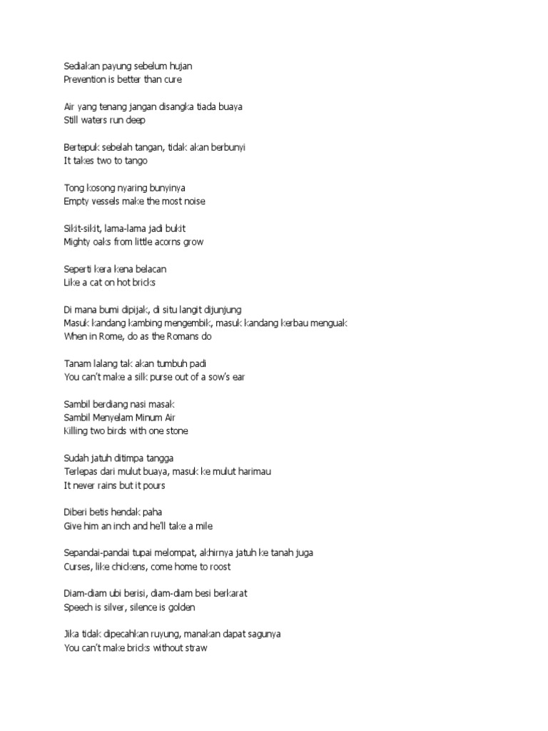 Those are the popular indonesian proverbs with english equivalent which mostly used in everyday life. Now we know the difference so how should we teach kids proverbs and idioms. In short proverbs are wise sayings based on comon sense or practicality. Curses like chickens come home to roost.