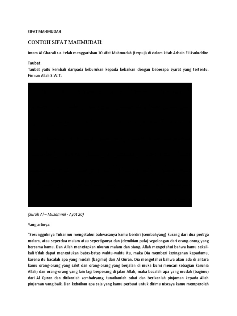Menurut imam al ghazali antara sifat mazmumah adalah seperti berikut. Amalan ringan berpahala besar. 10 sifat mahmudah dan mazmumah menurut imam al ghazali ditulis oleh redzuan ridz ilmu tasawuf ialah ilmu yang menyuluh perjalanan seseorang mukmin di dalam membersihkan hati dengan sifat sifat mahmudah atau sifat sifat yang mulia dan menghindari atau menjauhkan diri daripada sifat sifat mazmumah iaitu yang keji dan tercela. Yang terlebih afdal utama pada allah swt ialah orang yg banyak berlapar dan banyak tafakur berfikir sambil meneliti dan yang terlebih benci kepada allah ialah orang yang banyak makan banyak tidur dan.
