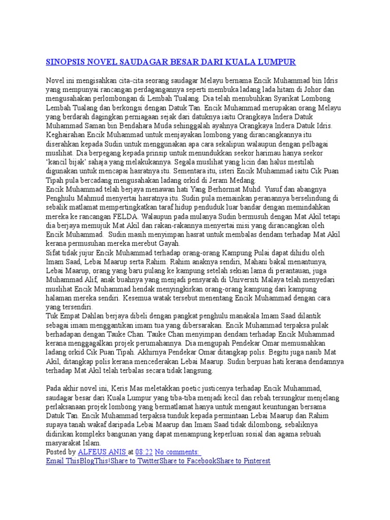 Sinopsis novel saudagar besar dari kuala lumpur novel ini mengisahkan cita cita seorang saudagar melayu bernama encik muhammad bin idris yang mempunyai rancangan perdagangannya seperti membuka ladang lada hitam di johor dan mengusahakan perlombongan di lembah tualang. Diunggah oleh sallehuddin rashid. Sinopsis bab saudagar besar dari kuala lumpur datuk tan pergi melawat pejabat encik muhammad iaitu seorang pengarah pengurusan firma serba dagang internasional kuala lumpur yang merupakan anak syarikat tan enterprise dan datuk tan menjadi pengurusinya datuk tan terpaksa menunggu kerana encik muhammad belum tiba lagi ketika di. Simpan simpan sinopsis saudagar besar dari kuala lumpur untuk nanti.