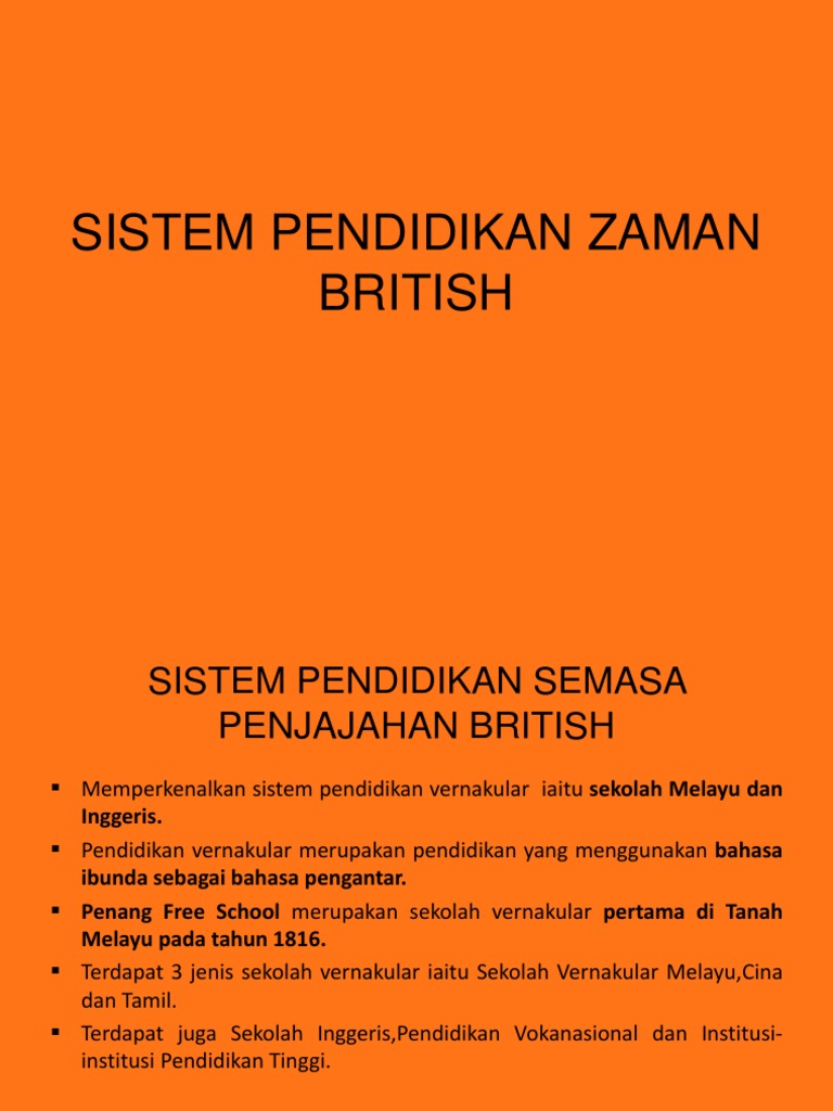 Sistem pendidikan zaman british. Sebenarnya pendidikan pada masa sekarang merupakan warisan daripada pendidikan sejak zaman pemerintahan inggeris di tanah melayu pada suatu masa dahulu dasar laissez faire yang diamalkan oleh british dalam pendidikan telah menyebabkan wujudnya liam jenis sistem persekolahan di tanah melayu yang berbeza hala tuju dan alirannya jenis persekolahan tersebut ialah sekolah vernakular melayu sekolah. Perubahan sistem pendidikan zaman british sistem pendidikan zaman penjajah lebih bersifat terpisah apabila setiap kaum menghantar anak anak mereka belajar di sekolah yang menggunakan bahasa ibunda masing masing sukatan pelajaran dan kurikulum juga tidak seragam sistem pendidikan aliran inggeris dianggap terbaik tidak terbuka kepada semua orang. Namun setelah british kembali ke tanah melayu selepas pemerintahan jepun sistem pendidikan diperbaiki semula mengikut budaya pendidikan zaman inggeris. Kurikulum di sekolah melayu hanya tertumpu secara minimum iaitu membaca mengira menulis ilmu pertukangan anyaman bagi memenuhi kehendak kehidupan luar bandar.