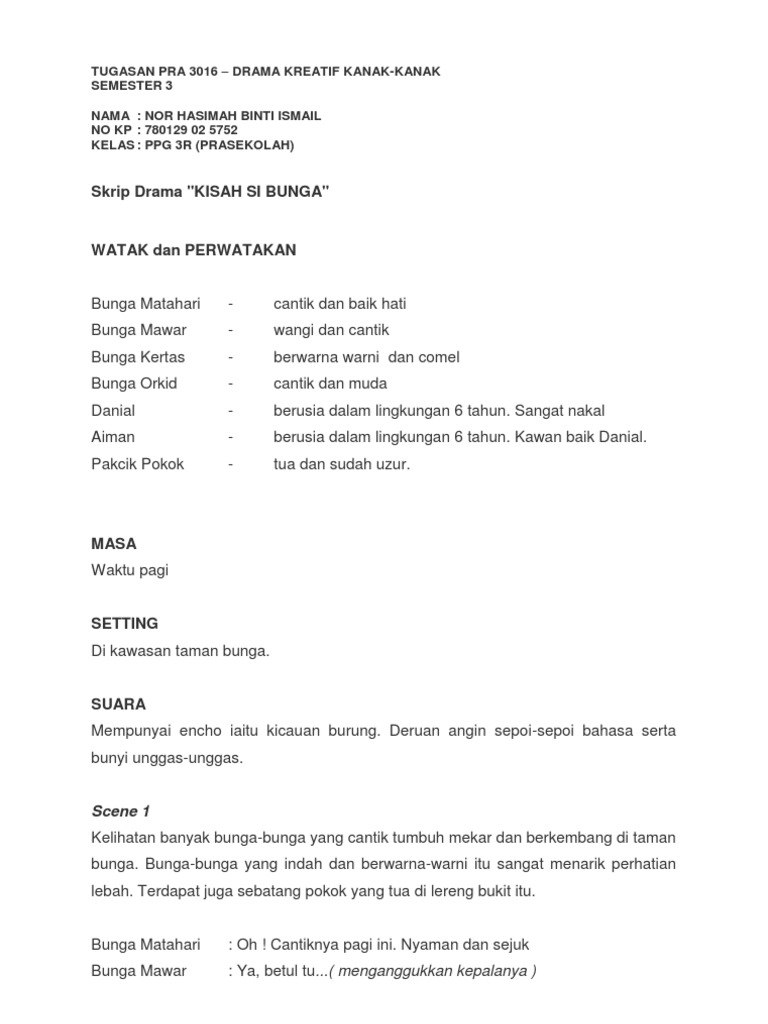 Pra 3106 perkembangan kreativiti dalam pendidikan prasekolah bermain drama bagi kanak kanak bermakna bermain dalam keadaan sebenar dengan tumpuan perhatian pada perincian masa dan tempat. Tadika kanak kanak ceria musical theatre drama duration. Sesuai untuk dijadikan sebagai bahan bantu belajar bbb bagi murid murid khususnya murid tahap 1. Memos lakonan bisu tanpa bahasa.