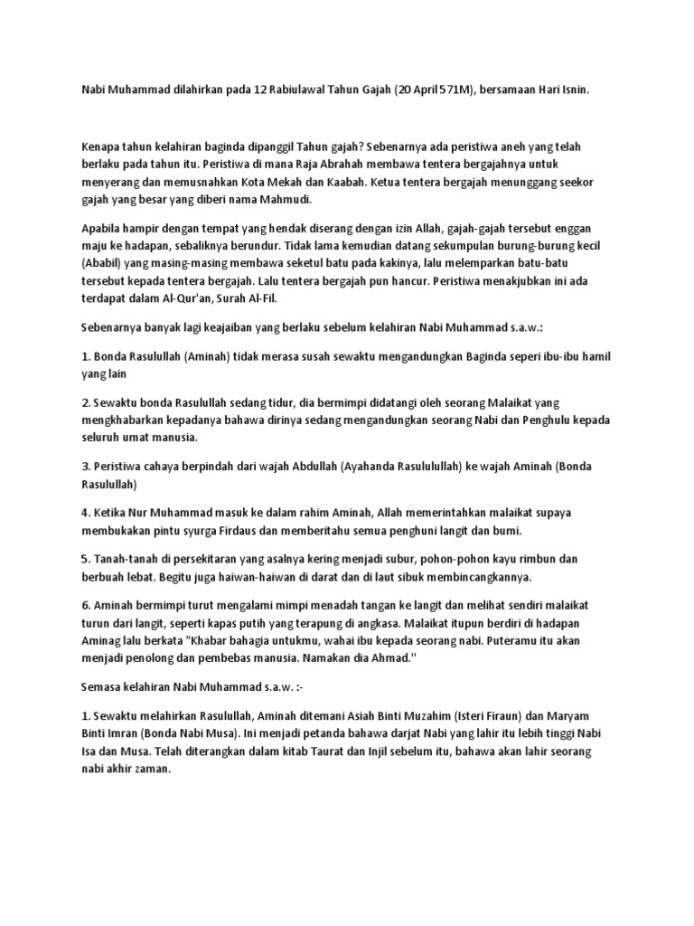 Republika co id menjelang kelahiran nabi muhammad shalallahu alahi wassalam kabah masuk target penghancuran tentara raja abrahah dari yaman. Pada tahun peristiwa penyerangan gajah inilah nabi muhammad shallallahu alaihi wa sallam lahir di hari senin tanggal 12 rabi al awwal. Mungkin masih banyak yang belum tahu mengapa tahun kelahiran nabi muhammad disebut tahun gajah. Apalagi jika kita ingin merunut tanggal lahir nabi muhammad dalam kalender masehi hal ini lebih sulit lagi.