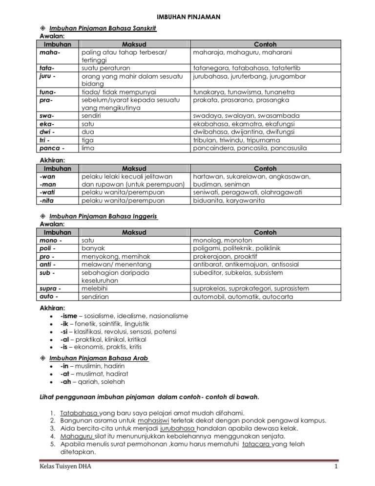 Imbuhan pinjaman diserapkan ke dalam bahasa malaysia melalui proses peminjaman. Imbuhan akhiranimbuhan akhiran terletak di akhir kata dasar. Borhan meminta bapanya membelikannya sebuah kamus. Dwihuruf dua huruf yang melambangkan satu bunyi sy ny ng 8.