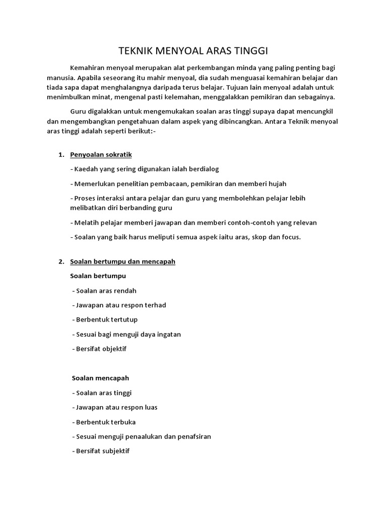 Teknik menyoal aras tinggi pdf. Maksud kemahiran menyoal merupakan alat perkembangan minda yang paling penting bagi manusia. Implikasi kajian ialah apabila soalan aras tinggi kurang digunakan semasa p p budaya berfikir dan penglibatan pelajar. Digunakan oleh guru ketika pengajaran bentuk soalan yang memberi tumpuan kepada skop skop tertentu. Perkara p merujuk kepada idea isu tajuk tema peristiwa atau teks individu i merujuk kepada individu.