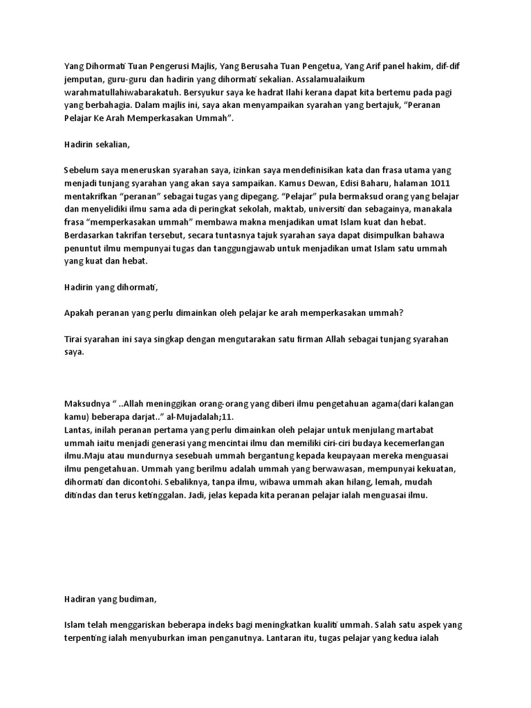 Teks syarahan agama sekolah mmenengah. Memupuk nilai cinta akan bahasa melayu sebagai bahasa kebangsaan. Peraturan pertandingan syarahan agama menengah sekolah sekolah kementerian pelajaran malaysia 2010 1. Membaca teks syarahan pidato dan skrip drama dengan sebutan dan intonasi yang betul nada yang sesuai serta kepantasan yang wajar.