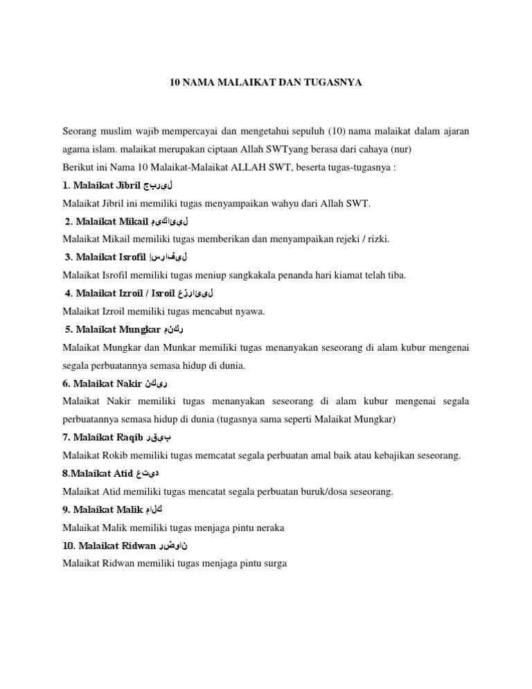 Banyak malaikat malaikat yang allah ciptakan seperti malaikat malakal maut namun yang wajib kita ketahui sebagai umat islam ada 10 nama malaikat. Berikut 10 nama malaikat dan tugasnya dalam islam. Namun ada 10 malaikatyang wajib kita kenal. Dalam buku quraish shihab dengan judul yang sama dengan yang di atas malaikat jibril dinamai ar ruh al amin dan.