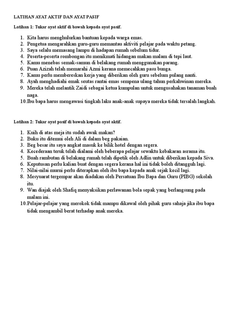 Latihan ayat aktif dan ayat pasif. 1 emak saya membeli sayur dan ikan di pasar a ayat aktif b ayat pasif 2 dia melukis gambar pemandangan dasar laut. Hutang tidak dapat dijelaskan oleh mereka sebelum hujung bulan ini. Ayat pasif ayat pasif ialah ayat yang menekankan mengutamakan objek dan perbuatannya.